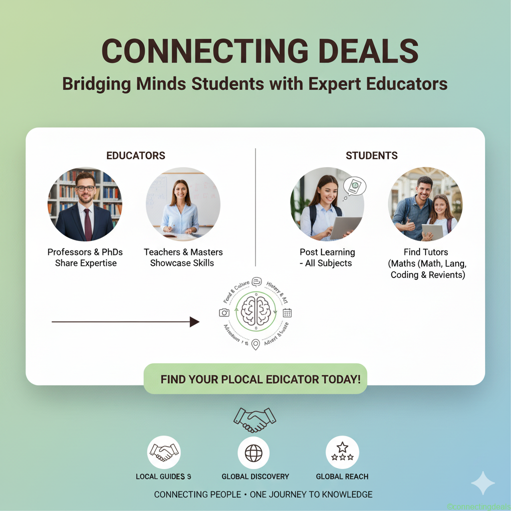 In essence, Connecting Deals aims to dismantle barriers in education, making expert tutoring and specialized instruction accessible to everyone. It’s about empowering educators to thrive and enabling students to unlock their full potential, by fostering genuine connections that transcend traditional learning boundaries.
