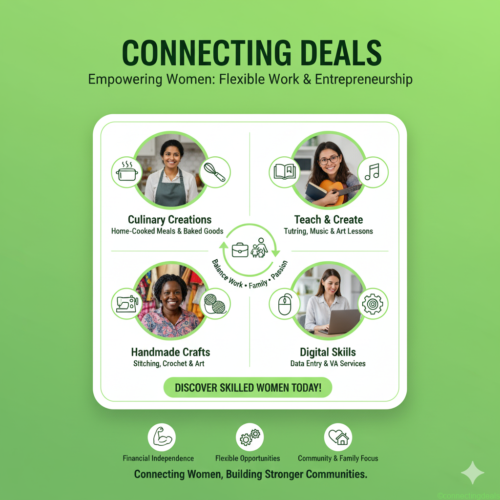 Connecting Deals stands as a testament to the belief that every woman possesses valuable skills waiting to be shared. By providing a flexible, accessible, and supportive platform, we aim to not only facilitate job opportunities but also to celebrate women’s diverse talents, foster economic independence, and build a stronger, more connected community where skill, passion, and family life can harmoniously coexist.